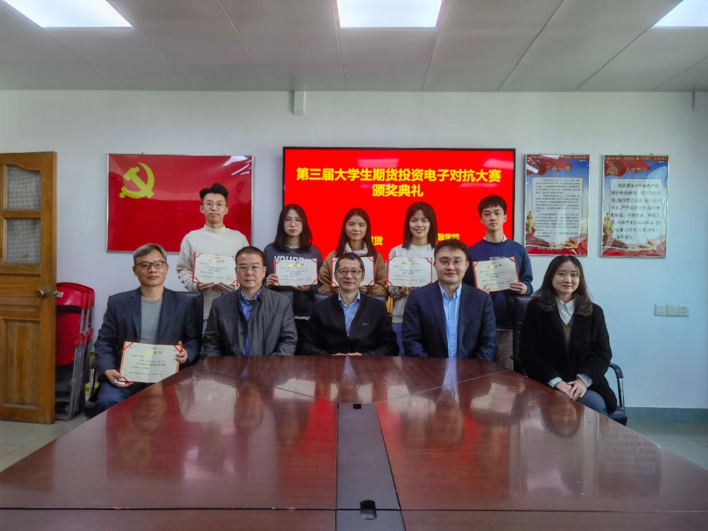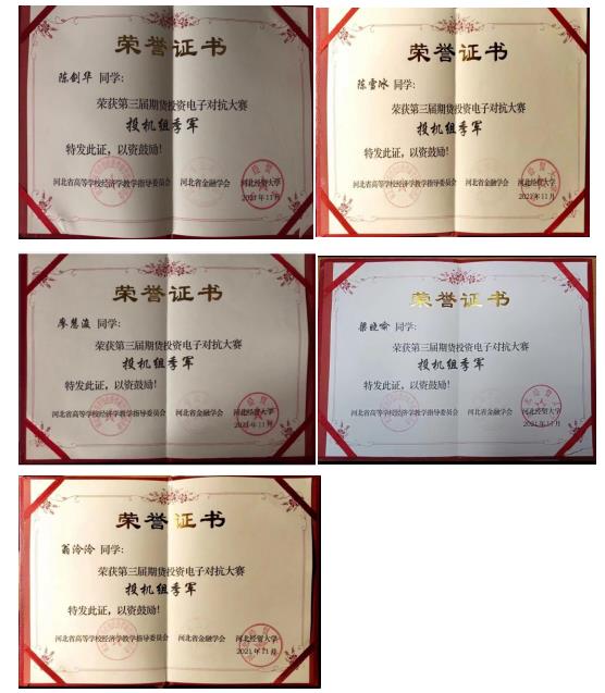 本届大赛是由永安期货股份有限公司和河北经贸大学联合举办第三届期货投资电子对抗大赛高校联赛,全国32所高校的296支队伍共1480名员工报名参赛。公司19级金融学CFA实验班组队参赛并荣获第三届期货投资电子对抗大赛投机组季军,获奖员工分别为陈剑华、陈雪冰、廖慧浚、梁晓喻、翁泠泠等5人。