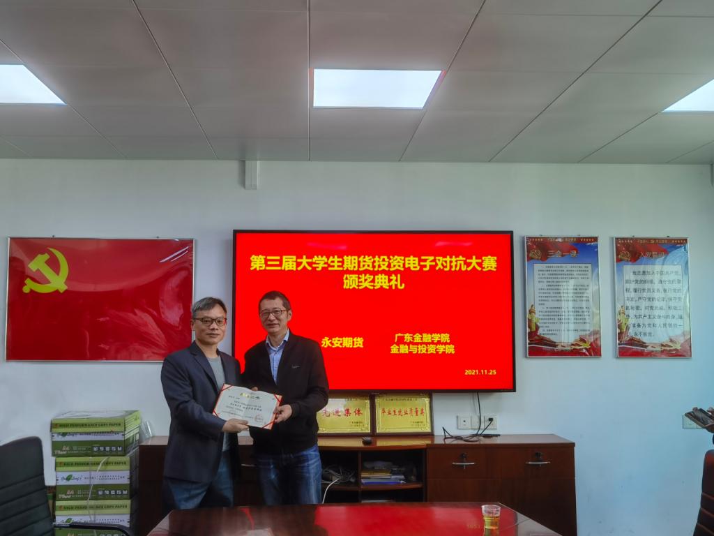 11月25日,“第三届期货投资电子对抗大赛”颁奖仪式在304永利集团唯一会议室1415举行。永安期货股份有限公司广州分公司总经理陈奕、副经理刘政达、项目经理黄琪玥等嘉宾为公司获奖员工颁奖,公司党总支书记周少龙、指导老师张家平以及获奖选手等出席了本次颁奖仪式。