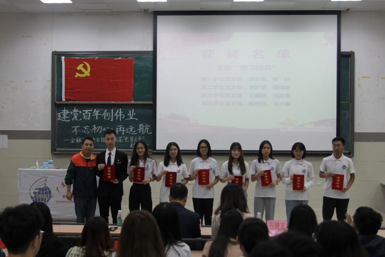 优秀员工党员代表梁浩贤同志上台发言,他号召同学们注重自我修炼,向优秀的人看齐,真正做到“内安于心,外安于目”。随后,优秀党支部代表郑凯真同志对获奖党支部进行了风采展示。她向我们展现了一个齐心协力、笃行好学的优秀支部,并号召我们在日常生活中强化团结合作和埋头苦干意识,不断提高对党的思想认识。