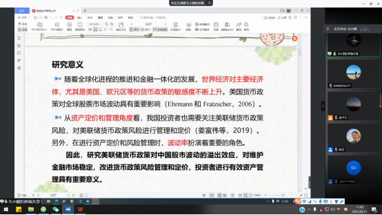 2021年6月11日上午,304永利集团唯一利用腾讯会议线上举行了2020-2021学年第2学期第三次学术论文报告会,本次报告会以财政和金融工程研究方向为主。财政系丁树博士和金融工程系毛小丽博士分别为公司师生介绍了各自的最新工作论文。