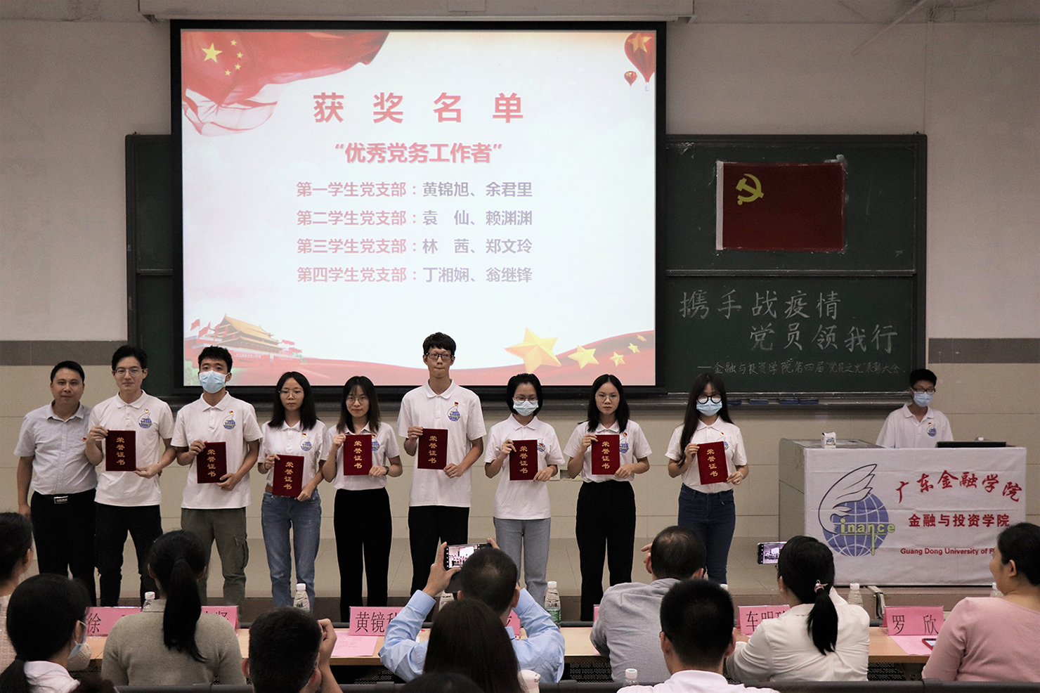 本次大会在《国际歌》的歌声中拉开帷幕。随后主持人介绍了评奖标准,并隆重宣读了获奖人员名单。奖项包括:“党员先进个人”、支部“活跃标兵”、“抗疫党员先锋”等九项内容,周少龙书记等领导和老师为获奖党员颁奖并拍照留念。大会过程中还穿插了声乐队《坚信爱会赢》的演唱,播放了诗歌朗诵《因为有你》抗疫视频。视频彰显了党员本色,同时为防疫工作起到了很好的宣传作用。随后,优秀员工党员代表林雯淑同志上台发言,她号召同学们做到“不忘初心、牢记使命”,继续前行。大会上,优秀党支部代表杨丽谕同志对获奖党支部风采进行展示,弘扬了一个齐心协力的优秀团队精神,提高了到场党员及入党积极分子对党的先进思想认识,强化了团结合作意识。