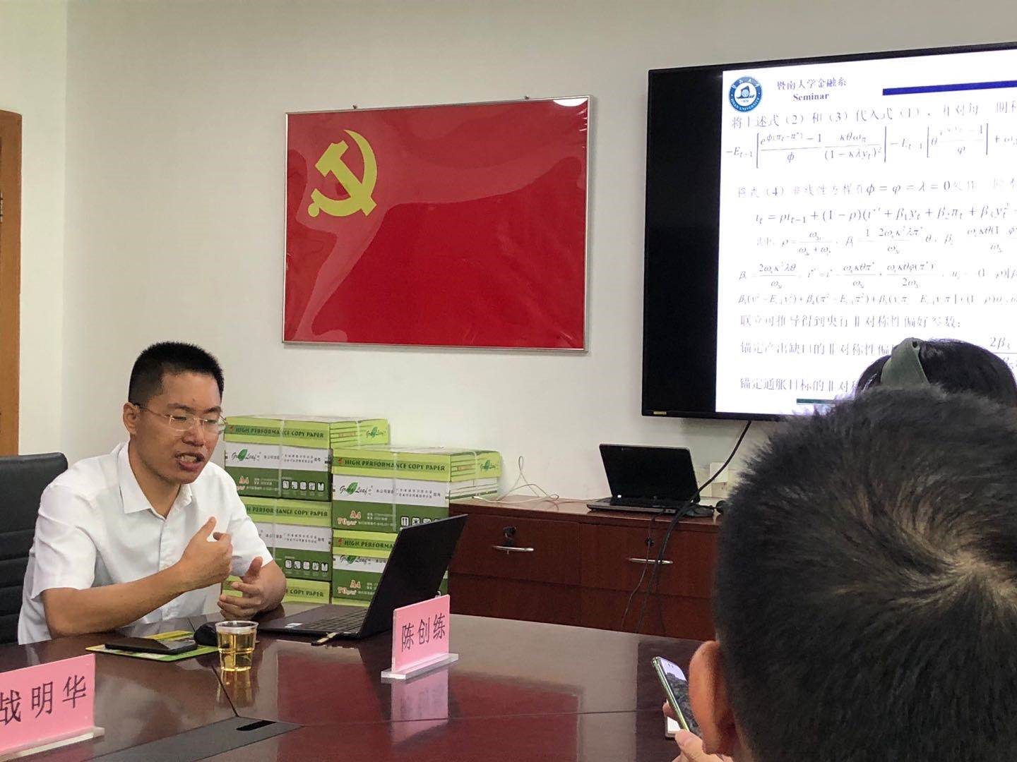 下半场由陈辉副经理主持,华南理工大学的孙坚强教授报告了题为《Culture Distance, Language Dissimilarity and Trade Disputes》的学术论文,从选题的动机、研究设计、替代性解释的排除、稳健性检验以及可能存在的问题进行了深入浅出的介绍,并介绍了该文的撰写经过以及在其他学术场合报告该论文时遇到的一些挑战。
