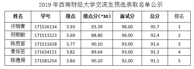 根据《关于预选2017级全日制本科生赴西南财经大学交流培养的通知》的要求,公司于7月6日进行了面试,按照前三个学期平均成绩、面试分各占50%的计分,现将录取名单公示如下: