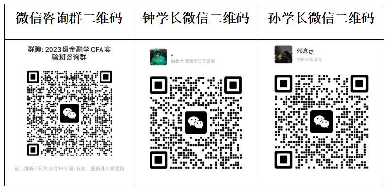 为了方便有意报考公司2023级金融学CFA实验班的新生了解相关招生信息与选拔测试流程,304永利集团唯一现开通官方微信咨询群“2023级金融学CFA实验班咨询群”(见下方群二维码),公司教师与在读金融学CFA实验班的学长学姐将入群为广大新生解答相关问题。请各位新生与家长入群后立即查看群公告,有序提问,并修改群昵称为“录取专业+员工真实姓名”,例如“互联网金融张三”或“资产评估李四家长”。当咨询群成员人数超过一百人时,无法直接通过扫码入群,可以添加下方两位学长的微信并由他们邀请进群。