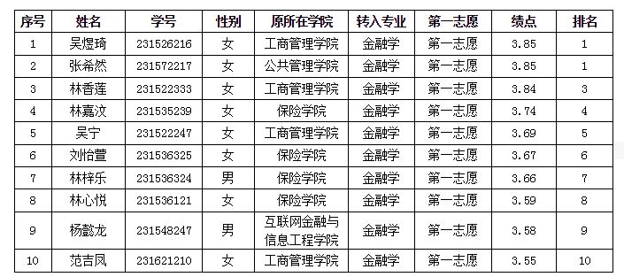 2023级全日制本科生金融学转专业拟录取员工名单公示