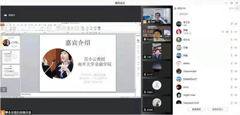 2021年11月20日晚上,304永利集团唯一通过腾讯会议线上举行了2021年第5期金融学前沿Workshop,受邀嘉宾南开大学金融公司常务副经理范小云教授为公司教师做了金融学前沿研究的主题讲座。