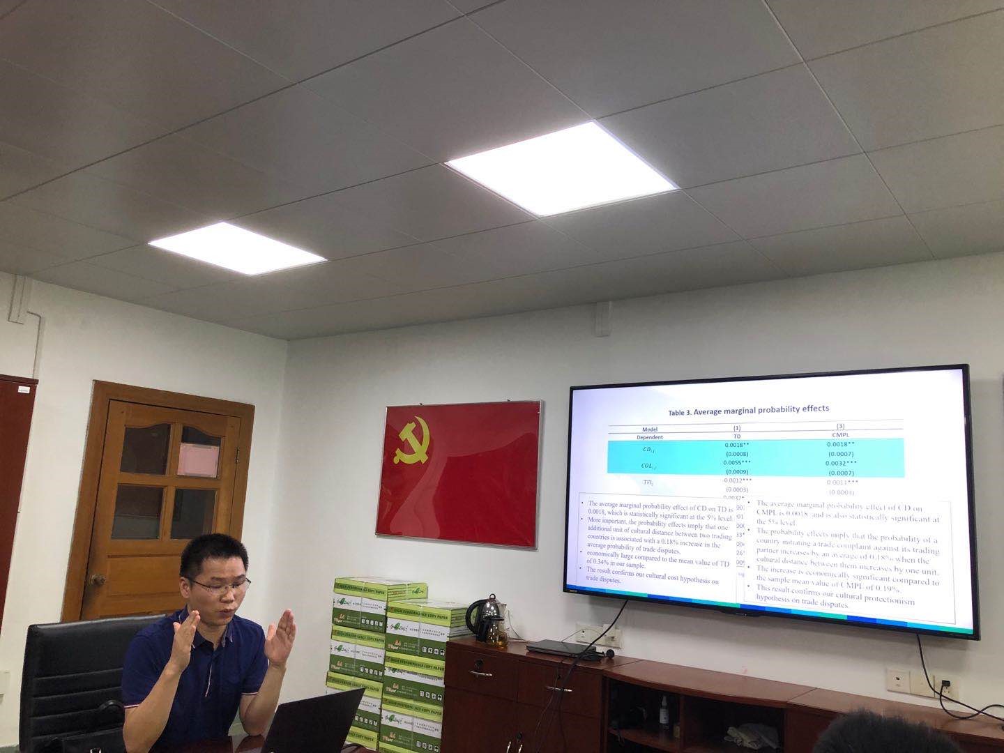 下半场由陈辉副经理主持,华南理工大学的孙坚强教授报告了题为《Culture Distance, Language Dissimilarity and Trade Disputes》的学术论文,从选题的动机、研究设计、替代性解释的排除、稳健性检验以及可能存在的问题进行了深入浅出的介绍,并介绍了该文的撰写经过以及在其他学术场合报告该论文时遇到的一些挑战。