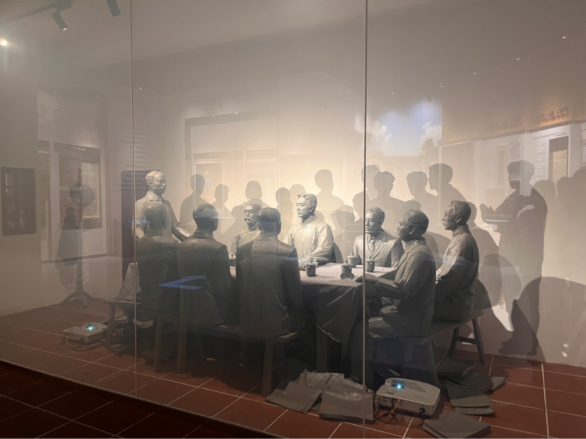 最突出的就是二楼展厅用雕塑与全息影像打造出的代表们开会的场景,代表们的表情栩栩如生,让支部党员们仿佛穿越时空,亲身体验了那场历史性的会议。这些雕塑像按照历史真实复原,代表们围着桌子开会,陈独秀正在激昂地讲话,毛泽东手握毛笔,正在做记录。过去的历史仿佛一幕幕又呈现在我支部面前,支部同志们纷纷体会到今日幸福生活的来之不易,向革命先烈表达了崇敬和缅怀。