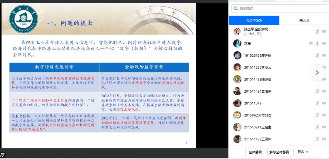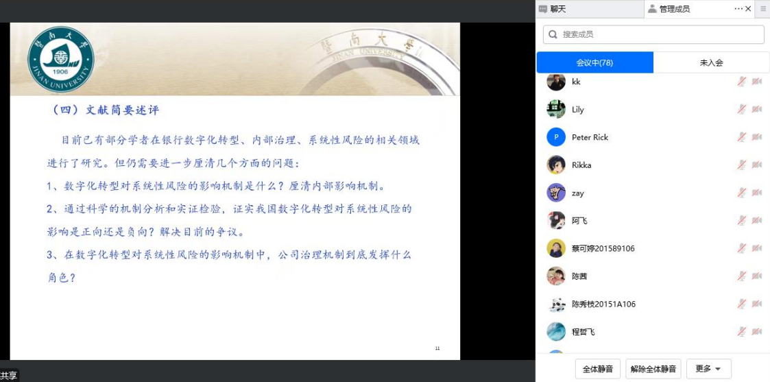 蒋海教授为参会师生分享了题为《数字化转型、内部治理与银行系统性风险》的最新研究成果。文章在数字经济发展和金融风险监管的背景下,通过理论建模探讨了银行数字化转型与银行系统性风险之间的关系,并对理论假设进行了实证研究。文章理论模型设定以及求解过程严谨,实证研究设计细致,实证结论讨论详实。蒋海教授现场详细回答了项后军经理、孙进军副经理、彭俊华博士、李瑞鹏博士等关于文章理论建模、银行规模的异质性、金融机构最适数字化水平等方面的诸多问题。论文讲座现场气氛活跃,参会教师意犹未尽,但因时间限制来不及参与交流讨论。