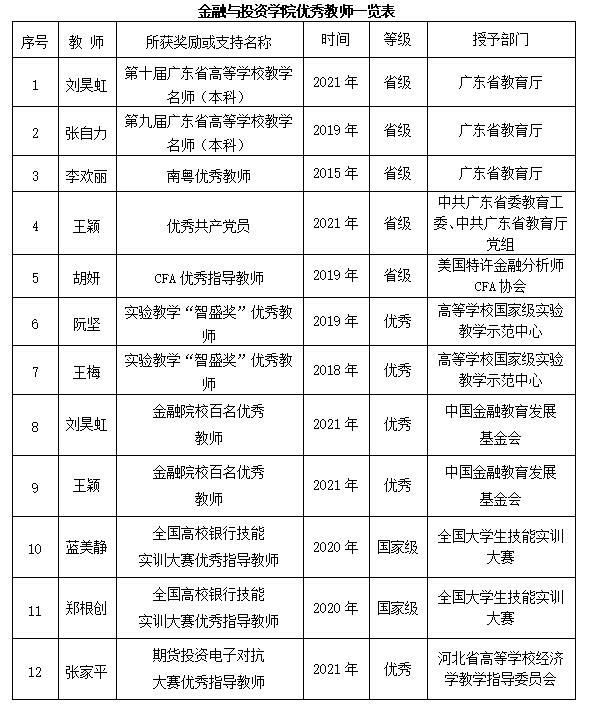 304永利集团唯一现有省级教学名师2人,南粤优秀教师1人,省级优秀共产党员1人,CFA优秀指导教师1人,全国金融实验教学“智盛奖”优秀教师2人,金融院校百名优秀教师2人,全国高校技能大赛优秀指导教师2人,期货投资电子对抗大赛优秀指导教师1人。